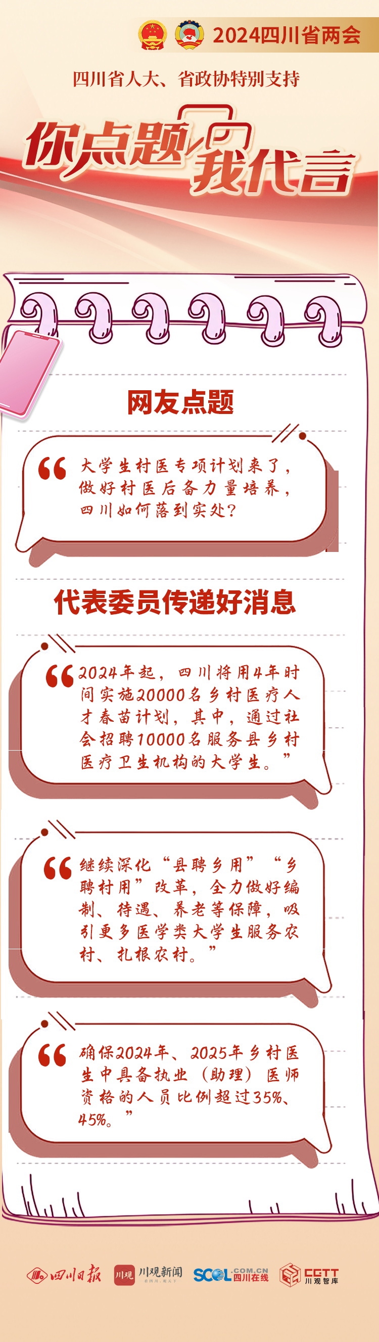 在“你点题 我代言——四川日报全媒体邀你‘上两会’互动平台”上,不少网友也关注这一话题,有网友留言:“大学生村医专项计划来了,做好村医后备力量培养,引育留住乡村医疗卫生人才,四川如何落到实处?”