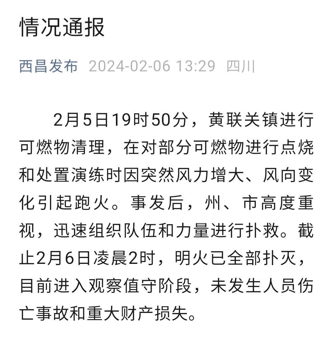 2月5日晚,多名网友在社交平台发布视频称,四川西昌市黄联关镇疑似发生山火。2月6日中午,当地发布了情况通报。