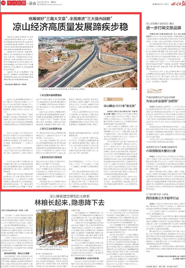 2月8日,四川日报刊发文章《统筹做好“三篇大文章”,全面推进“三大强州战略”凉山经济高质量发展蹄疾步稳》,聚焦2023年凉山州经济社会发展“成绩单”,各项事业取得扎实成效,全州经济高质量发展蹄疾步稳,现代化建设取得新成效。