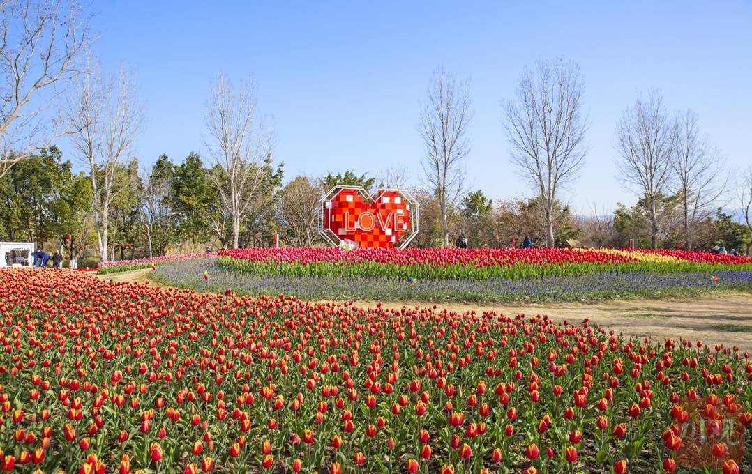 这片郁金香花海包括有汤姆王朝、皇家红、德马克、班雅等16个品种,彩虹、爱心、荷兰风车等造型独特、色彩斑斓的景观点缀其间,为市民游客勾勒出了最红火喜庆的新春图景。