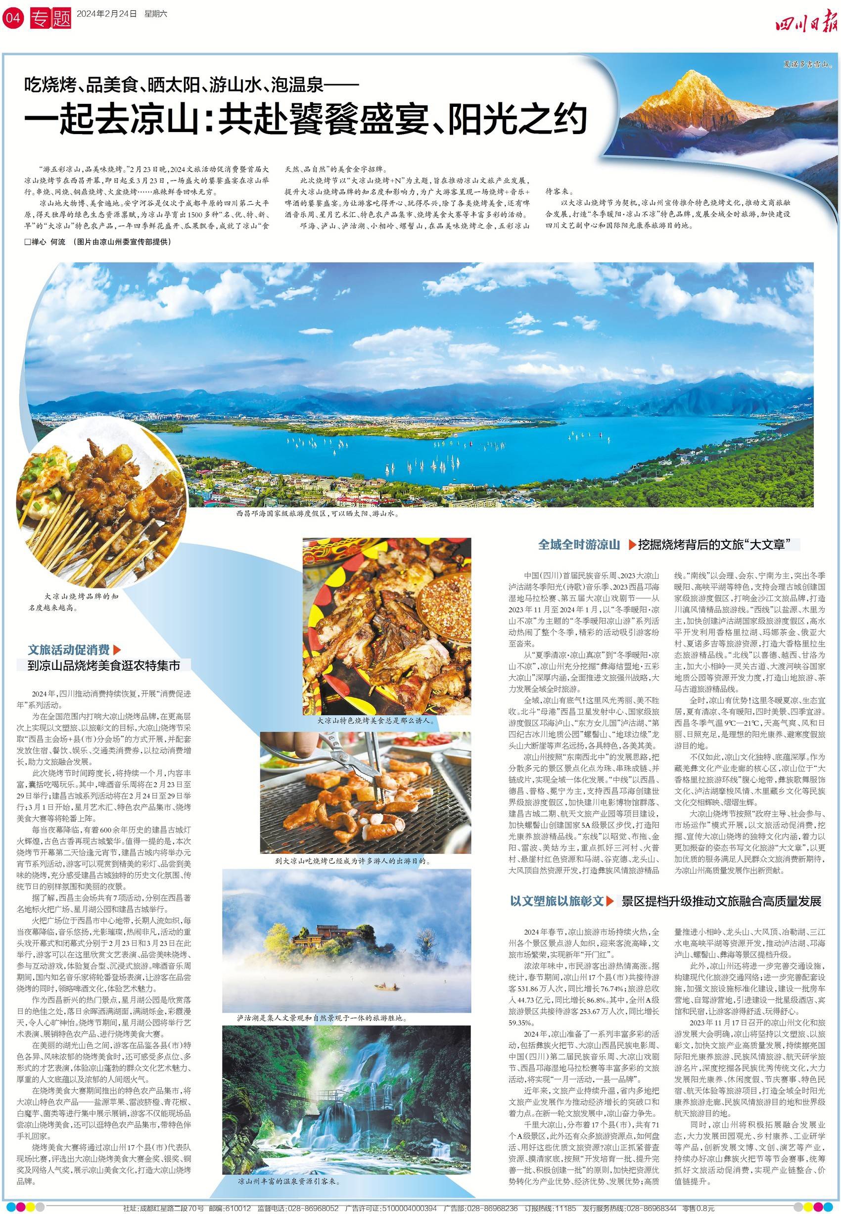 2月24日,四川日报刊发整版文章《一起去凉山:共赴饕餮盛宴、阳光之约》,稿件以23日晚开幕的2024文旅活动促消费暨首届大凉山烧烤节为由头,聚焦烧烤节期间的美食、音乐等各项活动,展现凉山游人的烧烤美食和丰富的文旅资源。烧烤节以“大凉山烧烤+N”为主题,将持续至3月23日,以此为契机,凉山州宣传推介特色烧烤文化,推动文商旅融合发展,打造“冬季暖阳·凉山不凉”特色品牌,发展全域全时旅游,加快建设四川文艺副中心和国际阳光康养旅游目的地。走,去凉山凉山“食天然、品自然”。