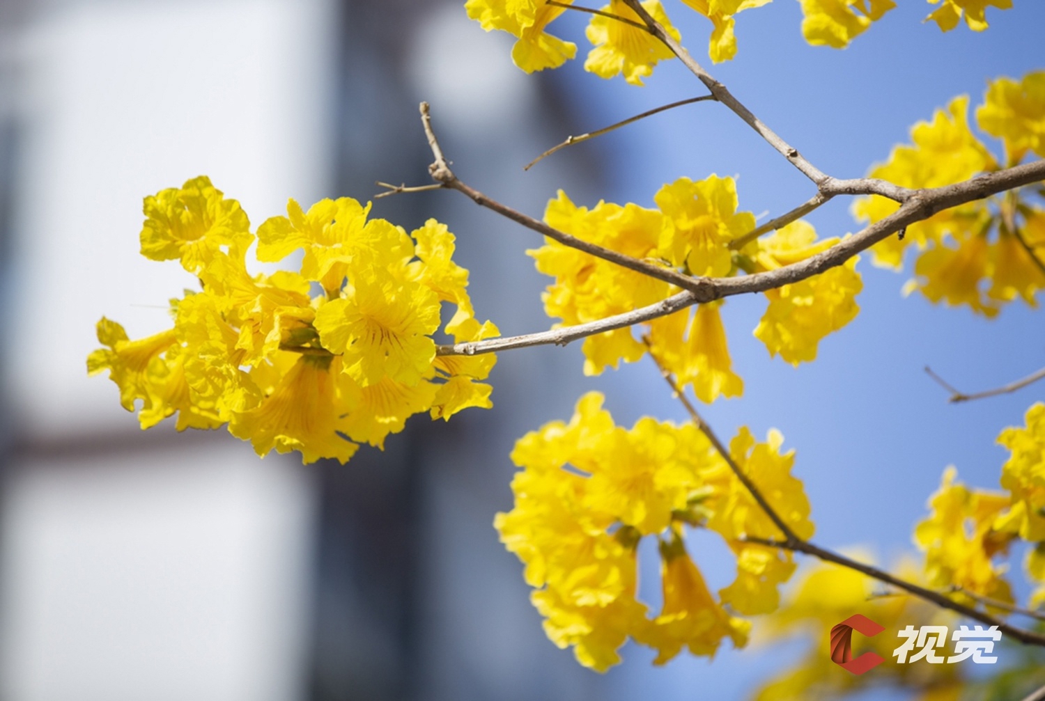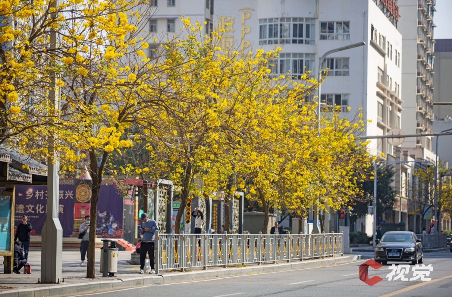 近日,凉山州西昌市天气晴好,月海路上的黄花风铃木迎来了盛花期。“一树金黄一树香,风铃摇醒醉春光”,一年的等待化作此刻花开。