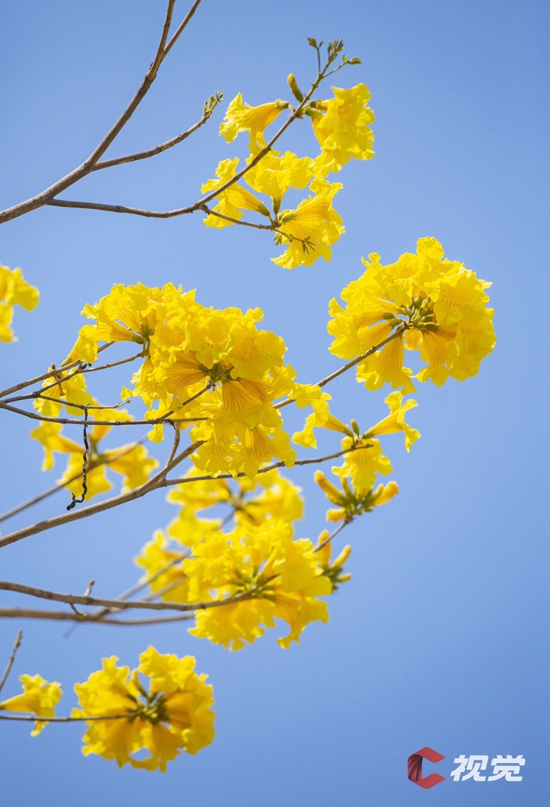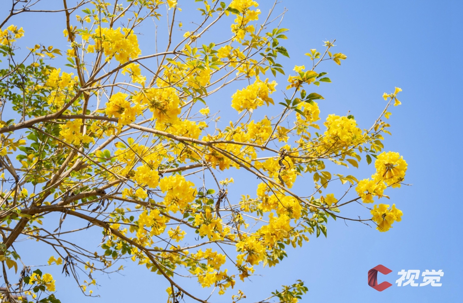 一簇簇、一团团,万盏花朵挂满树梢,炽烈又明媚,将月海路装扮成了金黄“花路”。满树花团随着微风轻摇身姿,每一次摇曳,都洋溢着春天的热情。