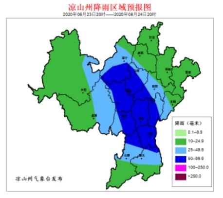 ★ 需要提醒的是,凉山州及冕宁、喜德、木里、昭觉等县级气象台昨天晚间发布的暴雨黄色预警信号,目前已全部解除。但是!截至记者发稿,凉山州昨天下午发布的暴雨蓝色预警仍未解除,预计今天(6月24日)白天,全州仍处于中到大雨天气过程之中。气象部门警告,西昌市、冕宁县、喜德县、德昌县、宁南县、普格县、布拖县、昭觉县、会理县、会东县的局部地区发生中小河流洪水和山洪地质灾害的气象风险等级高;木里县、盐源县、甘洛县、越西县、美姑县、雷波县、金阳县的局部地区,发生中小河流洪水和山洪地质灾害的气象风险等级较高。请相关人员注意防范。预计凉山州今天最高气温30.5℃。