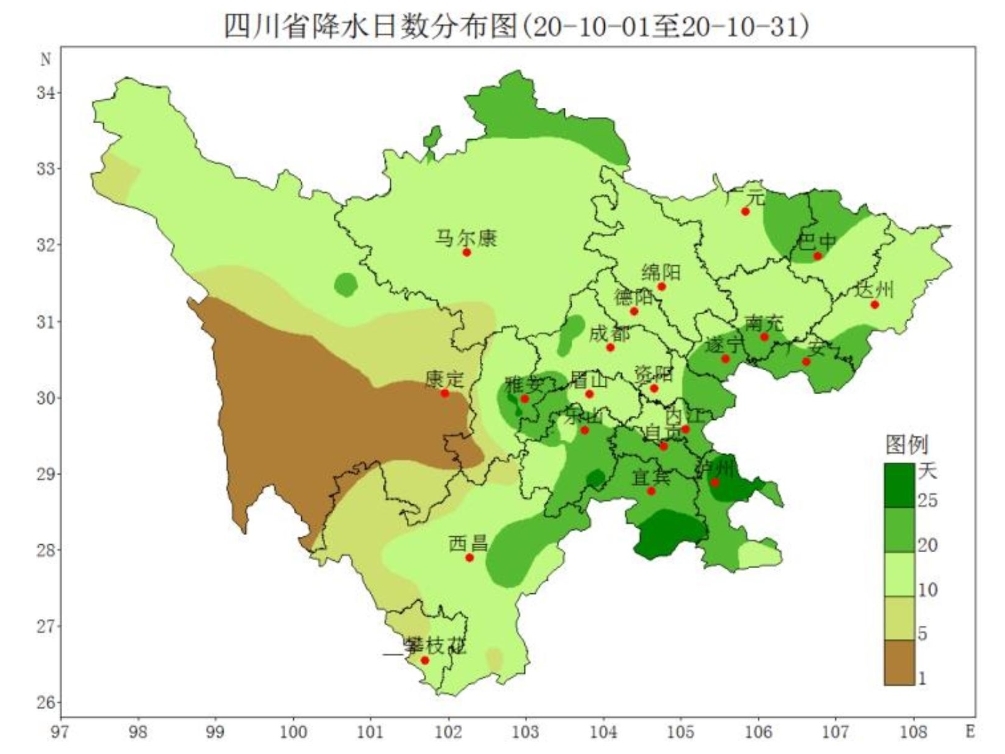 据统计,10月,全省平均降水日数达16.7天,较常年同期偏多2.1天,位列历史同期第10多位。其中,合江、遂宁、荥经、宜宾县、犍为、昭觉、炉霍、九寨沟8个气象站降水日数达历史同期最多。