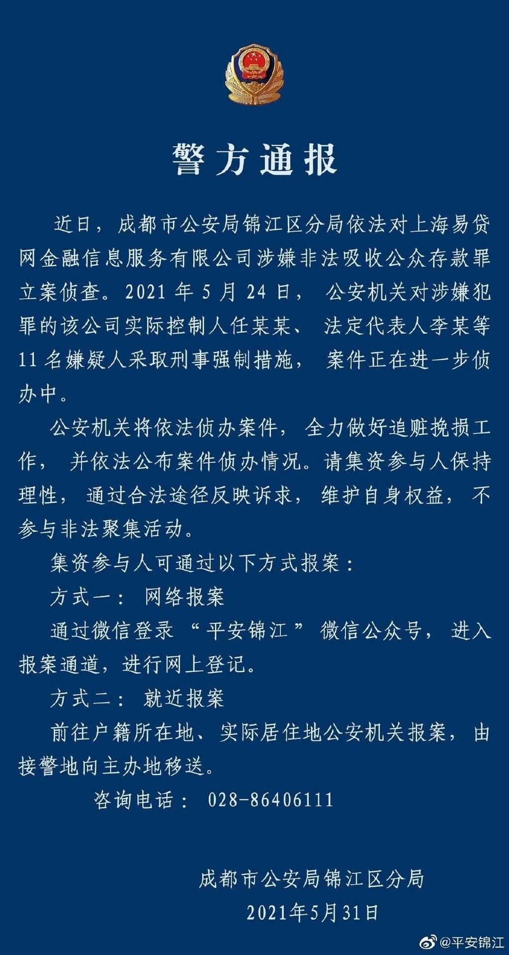 近日,成都市公安局锦江区分局依法对上海易贷网金融信息服务有限公司涉嫌非法吸收公众存款罪立案侦查。2021年5月24日,公安机关对涉嫌犯罪的该公司实际控制人任某某、法定代表人李某等 11名嫌疑人采取刑事强制措施, 案件正在进一步侦办中。