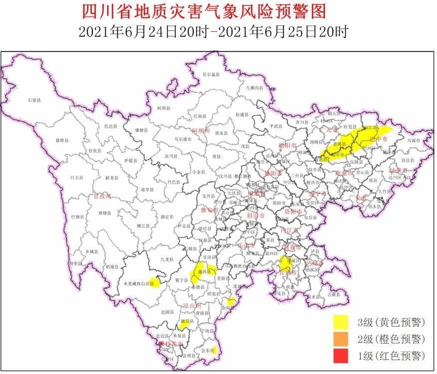 6月24日,四川省地质灾害指挥部办公室结合四川省气象台天气预报情况,发布地质灾害气象风险黄色预警:6月24日20时~6月25日20时,广元、巴中、南充、宜宾、凉山等市州共有25个县(市、区)进入黄色预警范围。