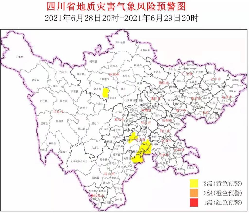 6月28日,四川省地质灾害指挥部办公室结合四川省气象台天气预报情况,发布地灾黄色预警:结合四川省气象台天气预报情况,6月28日20时~6月29日20时,乐山、宜宾、阿坝、凉山共有11个县(市、区)进入黄色预警范围,较前一日向北转移。