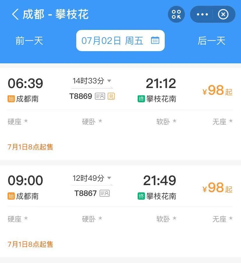 2、7月2日至9月1日加开成都南-攀枝花南T8867次,成都南09:00开、攀枝花南21:49到。列车运行12小时49分钟。