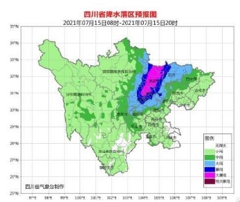 7月15日8时至20时,盆地大部阴天有阵雨或雷雨,雷雨时伴有短时阵性大风,其中成都、德阳、绵阳、广元、眉山5市和雅安东部及巴中、南充、遂宁、资阳4市西部有大雨到暴雨,局部大暴雨;川西高原和攀西地区阴天间多云有阵雨或雷雨,其中阿坝州东部和甘孜州南部有中雨,局部大雨。