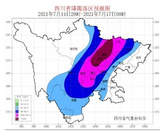 值得注意的是,在7月14日下午发布的暴雨黄色预警中,四川省气象台进一步拉响警报:14日20时到15日20时,个别地方雨量可达250毫米以上。暴雨时并伴有雷电和雷暴大风天气。