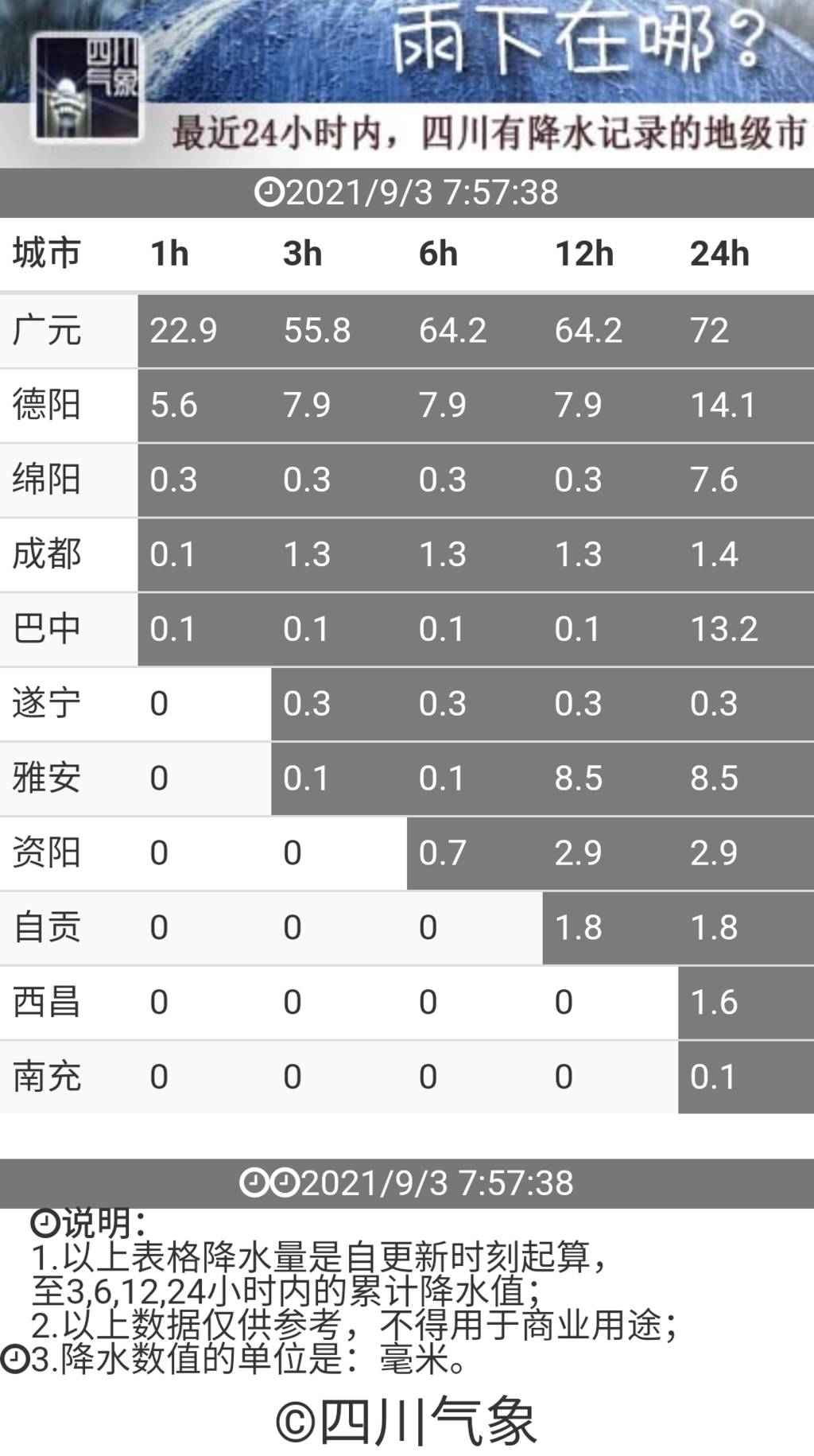 气象监测显示,截至今天(9月3日)8时,过去24小时内四川有11市出现降雨,其中以广元降水量最大↘↘