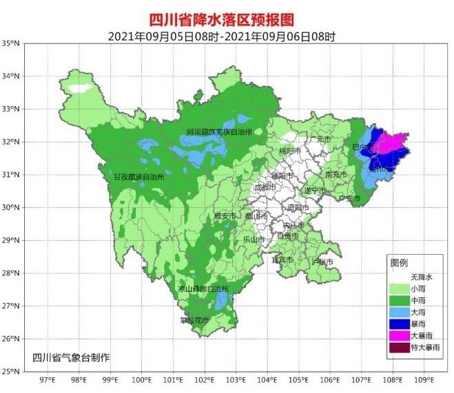 9月4日白天到晚上,盆地各市阴天有小到中雨,其中巴中、南充、遂宁、资阳4市和广元、绵阳、德阳、成都、雅安5市东部及达州、广安2市西部有大雨到暴雨,局部大暴雨;川西高原和攀西地区大部阴天间多云有阵雨或雷雨,局部有中雨。