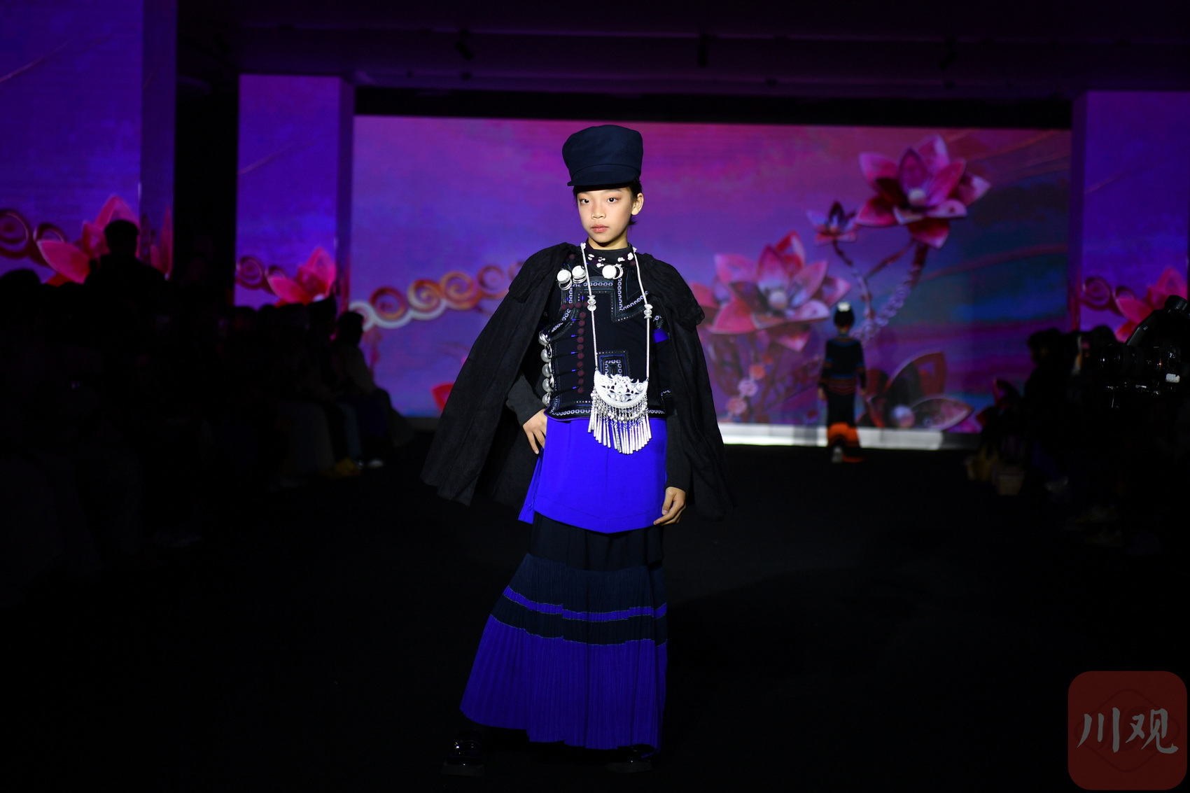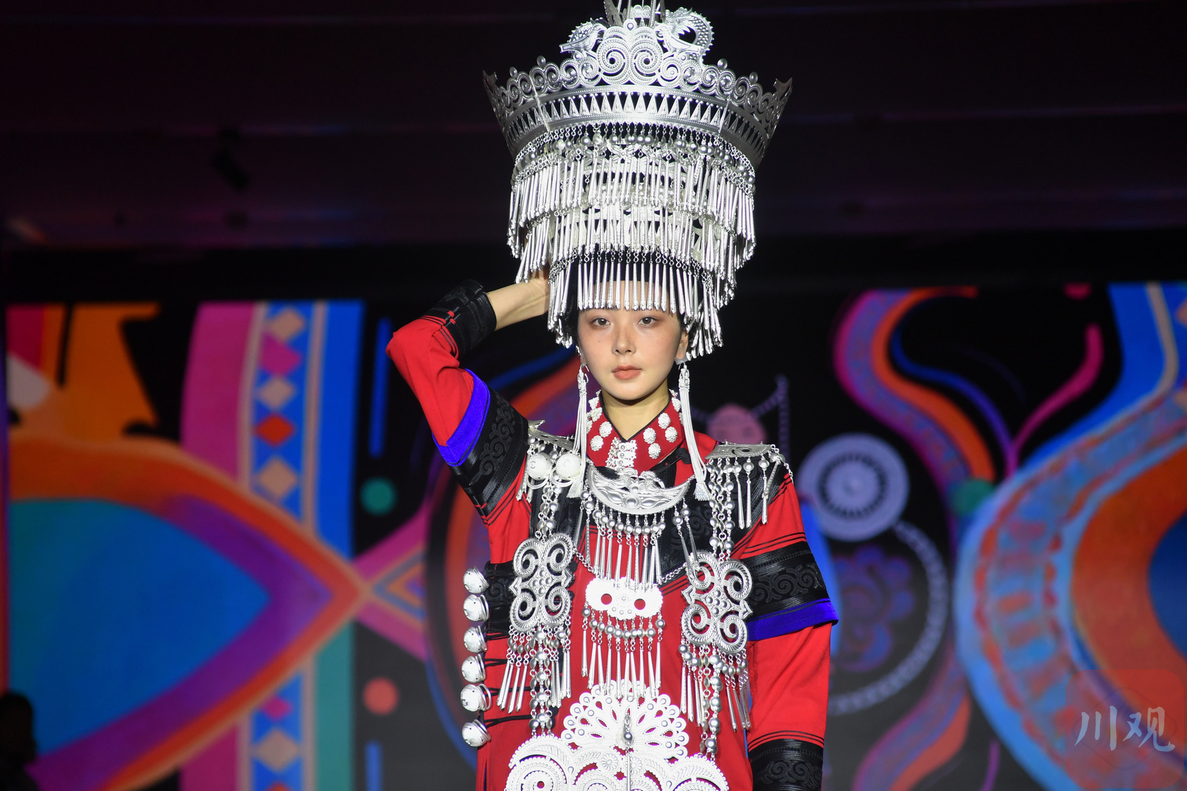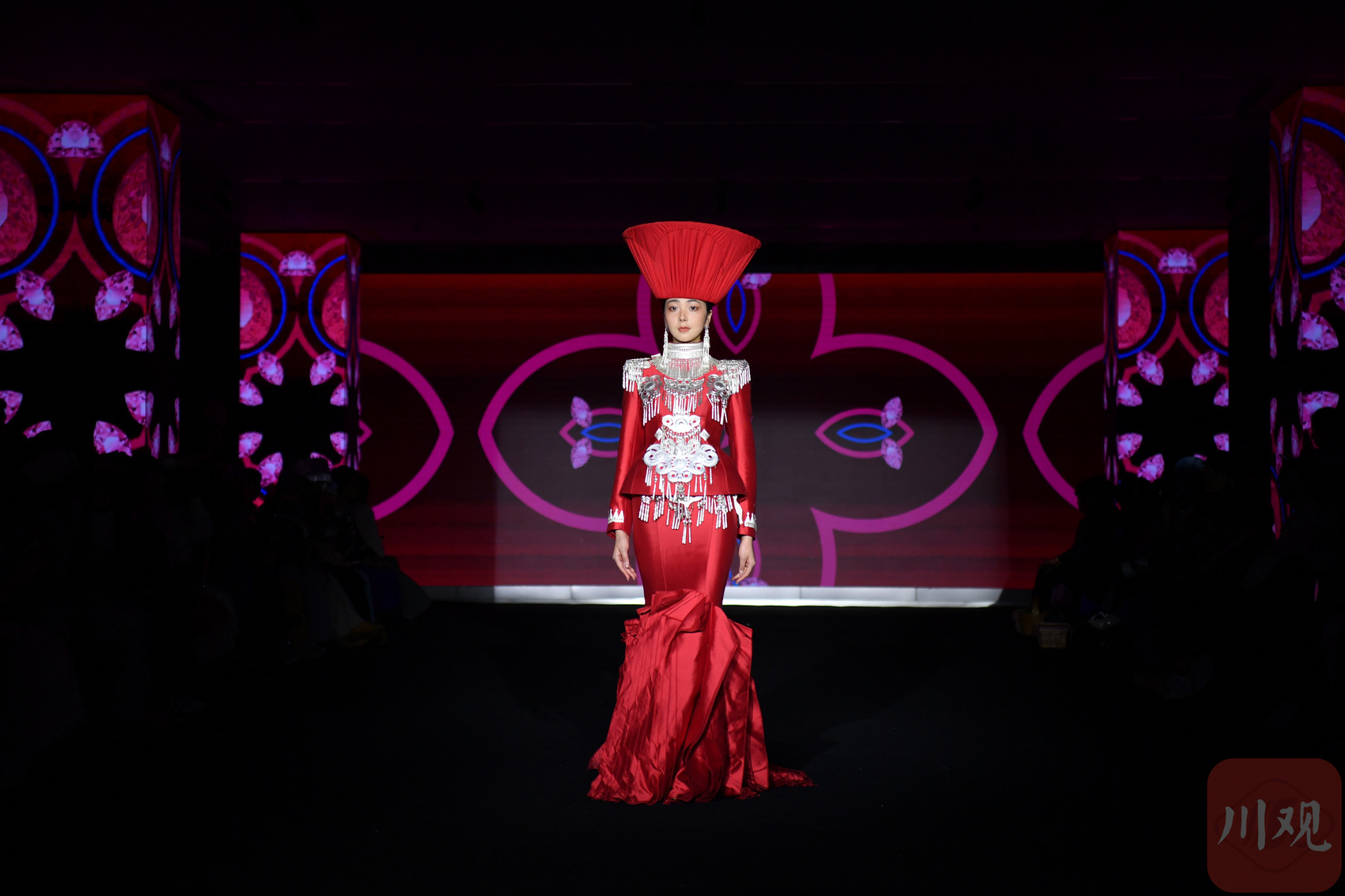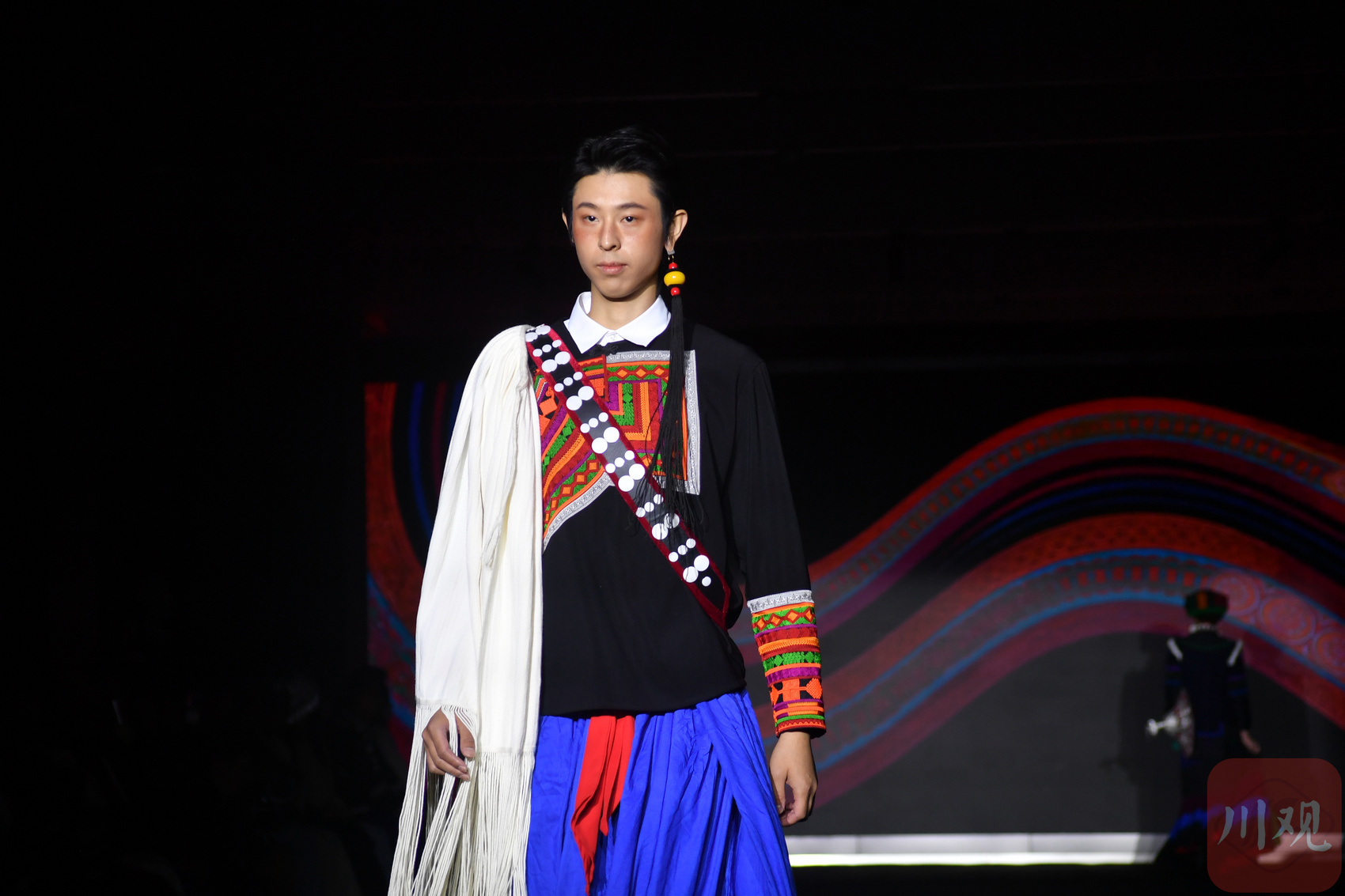 整场秀以“生息、古老、焕新”三大篇章为线索,从传统生活到现代设计逐步展开。舞台上,模特身上的服饰没有简单照搬传统,而是通过剪裁、搭配和整体造型,将越西日常与仪式中的手工技艺——如刺绣、织染、银饰——融入现代服装结构。传统纹样和材质在保留文化辨识度的同时,结合版型、色彩和搭配的调整,让彝族传统服饰保留独特韵味的同时接近现代审美。