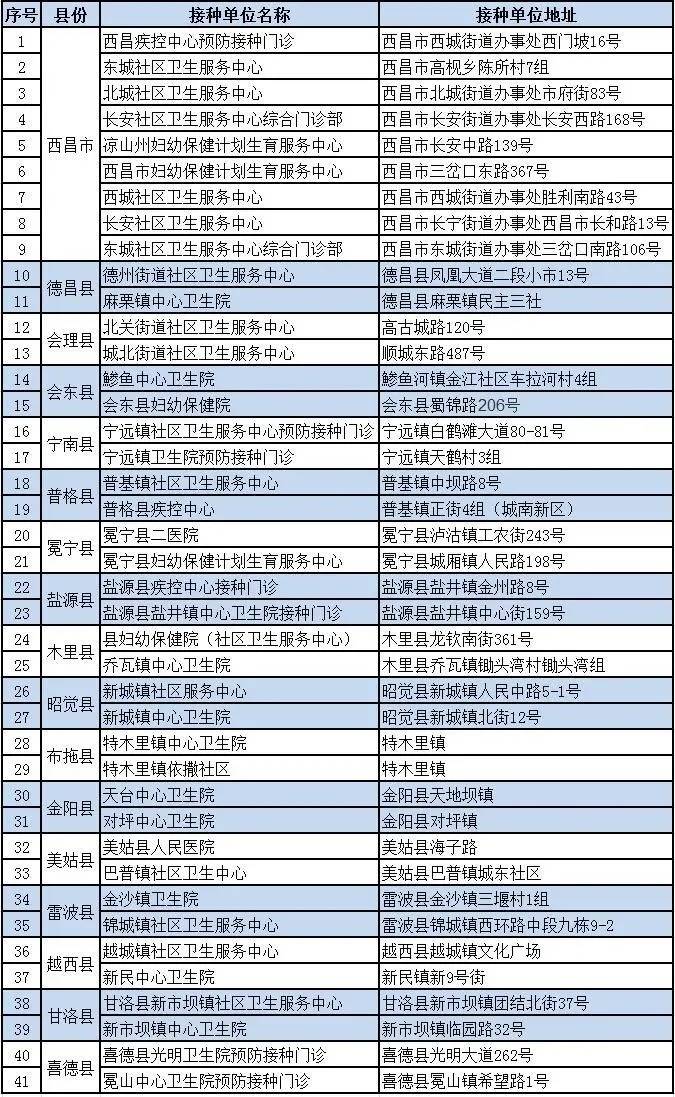 记者了解到,凉山州有新冠疫苗接种点41个,覆盖全州17县市,州府西昌市有9个点,包括凉山州妇幼保健计划生育服务中心和多个社区卫生服务中心,其余各县为每县两个点。