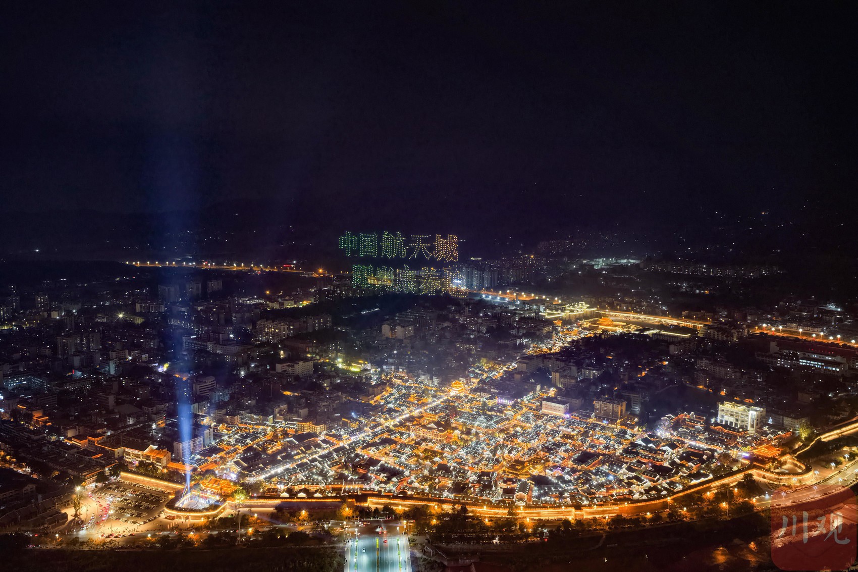 当晚八点,无人机表演亮相。数百架无人机编队在古城上空变换阵型,不少游客驻足拿起手机拍照,科技光影与古城墙交相辉映,打造出壮观的视觉盛宴。