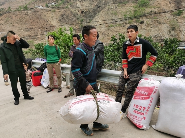 早上8点,接人的客运车已经开到悬崖村牛觉组,已有20多位村民带着行李在此集结。