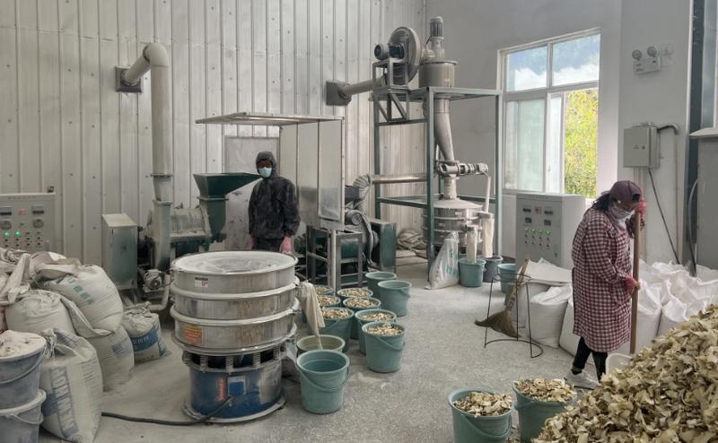 走进生产线车间,机器轰鸣声此起彼伏。在切片烘干区,魔芋生产负责人田忠林正操作半自动化设备,将清洗去皮后的魔芋切成均匀薄片。“我们要加工4500吨左右的鲜魔芋,精粉大概是300吨,总产值是2500万左右。”他边说边指向传送带上的魔芋干片,“这些干片还要经过挑选,再磨成粉、均质、包装,最后入库变成魔芋精粉,每一步都有标准,品质有保障。”