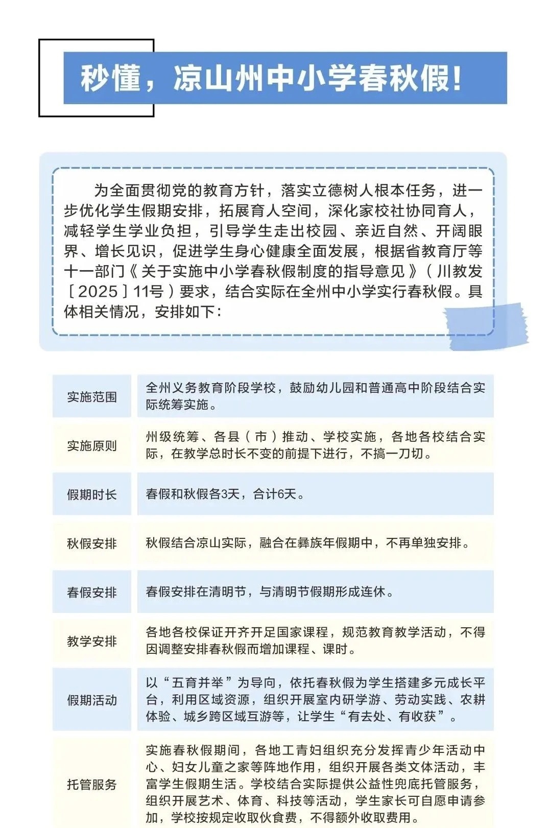 11月8日,凉山州教育和体育局发布中小学春秋假相关情况安排。其中明确,春假安排在清明节,与清明节假期形成连休;