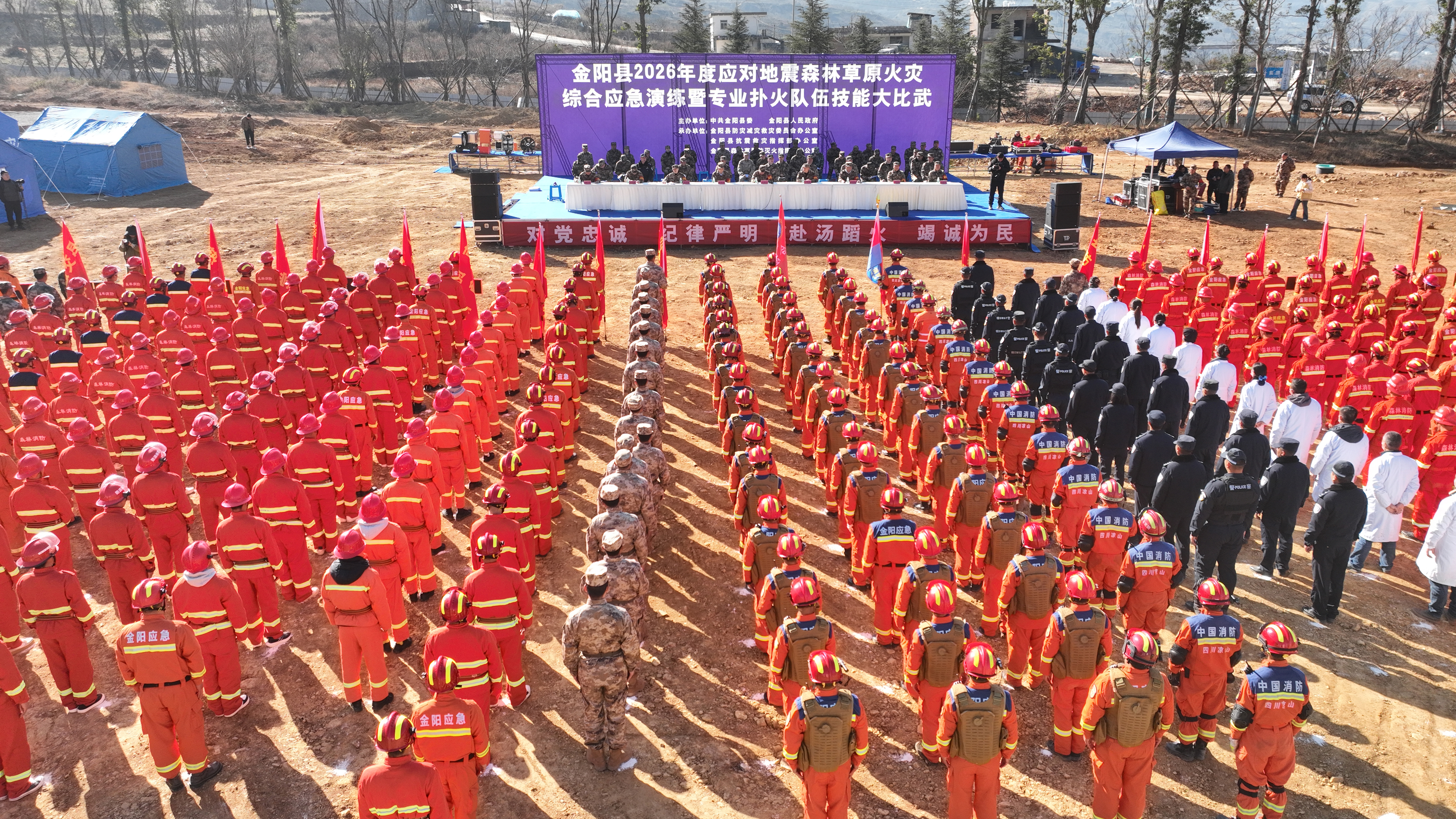 1月13日,金阳县举行2026年度应对地震森林草原火灾综合应急演练暨专业扑火队伍技能大比武。本次演练以“实战导向、科技赋能、协同作战”为核心,全面覆盖应急响应、多科目处置、响应结束及总结提升四大环节,共设置12个实战科目。24支参演队伍、425名人员协同联动,构建“空地一体”应急处置格局,圆满完成各项预设任务。