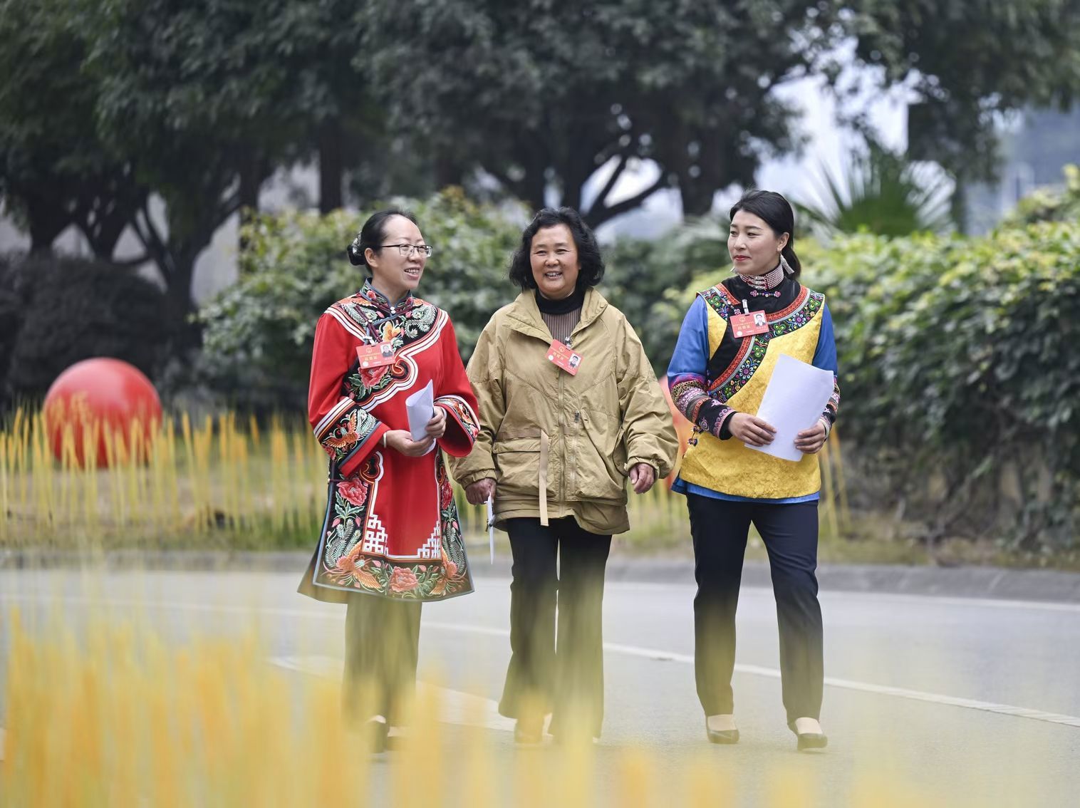 省人大代表禄兴琼(左)、杨再平(中)与阿衣尔金(右)就大家共同关注的领域展开交流。 川观新闻记者 杨树 摄影