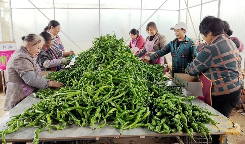 种植大棚内,一排排设施蔬菜大棚整齐排列,大棚内一米多高的椒树绿意盎然,绿油油的螺丝椒挂满枝头。
