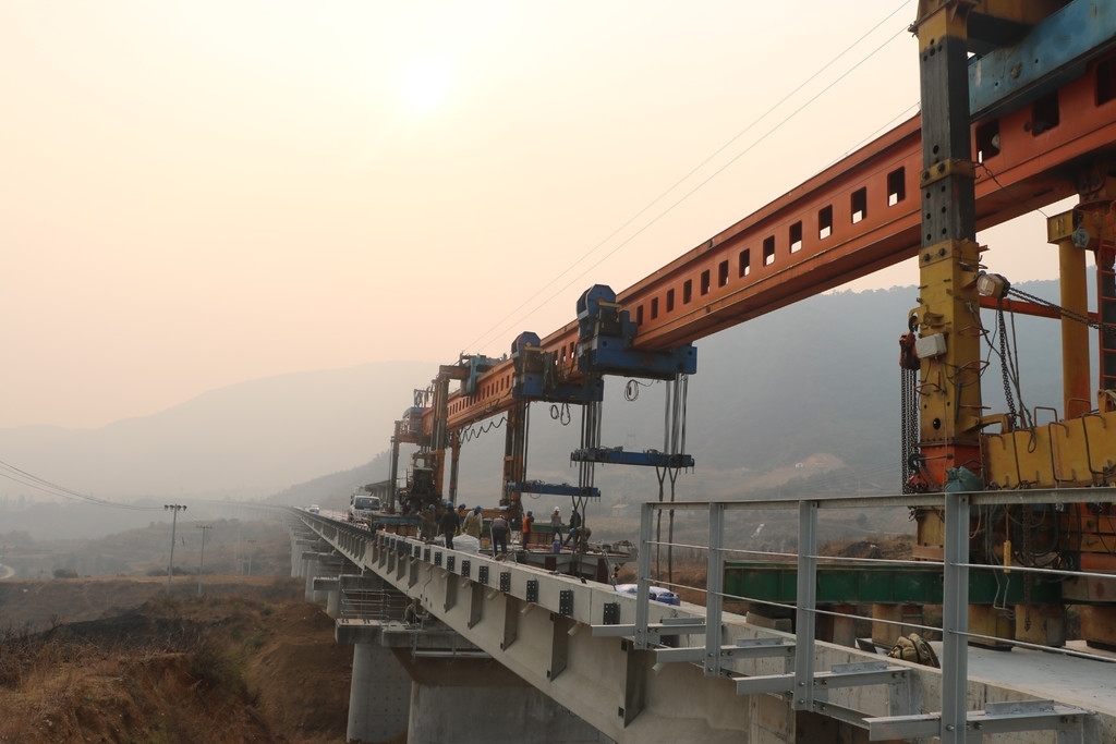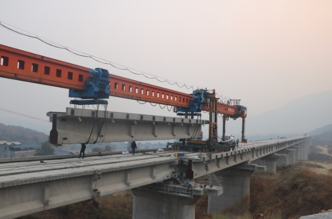 金凤村双线特大桥位于凉山州冕宁县境内,全桥共有桥墩72个,最高墩身为37米。大桥于11月20日开始铺架,全桥共架设284片T梁,每片T梁重约134吨。经过施工人员的不懈努力,大桥顺利完成铺架,比计划工期提前了8天。
