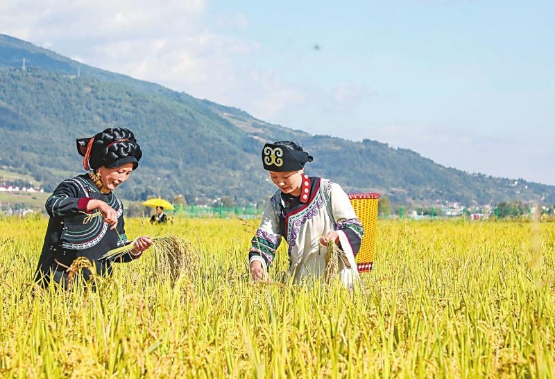 下图:且拖村彝族群众在田间采新谷。 李结义 摄(视觉四川)