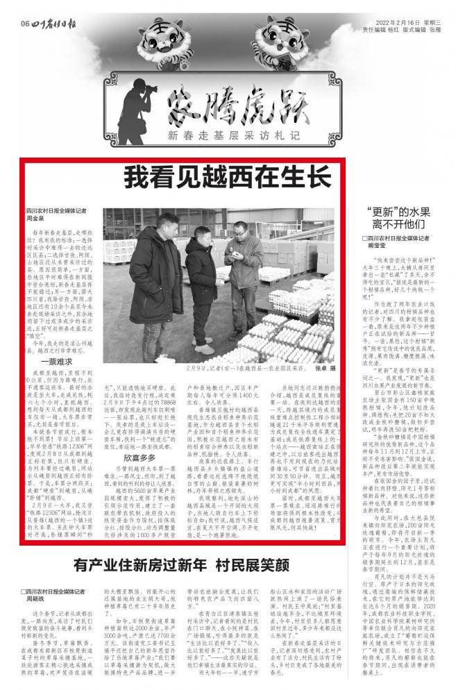 2月9日,记者(右一)在越西县一农业园区采访。 张卓 摄
