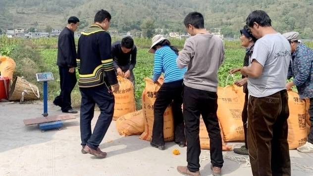 花农们排着队将所采摘的万寿菊装入麻袋,整齐地堆放在路边,再由村上统一联系买家,即时上称装车。