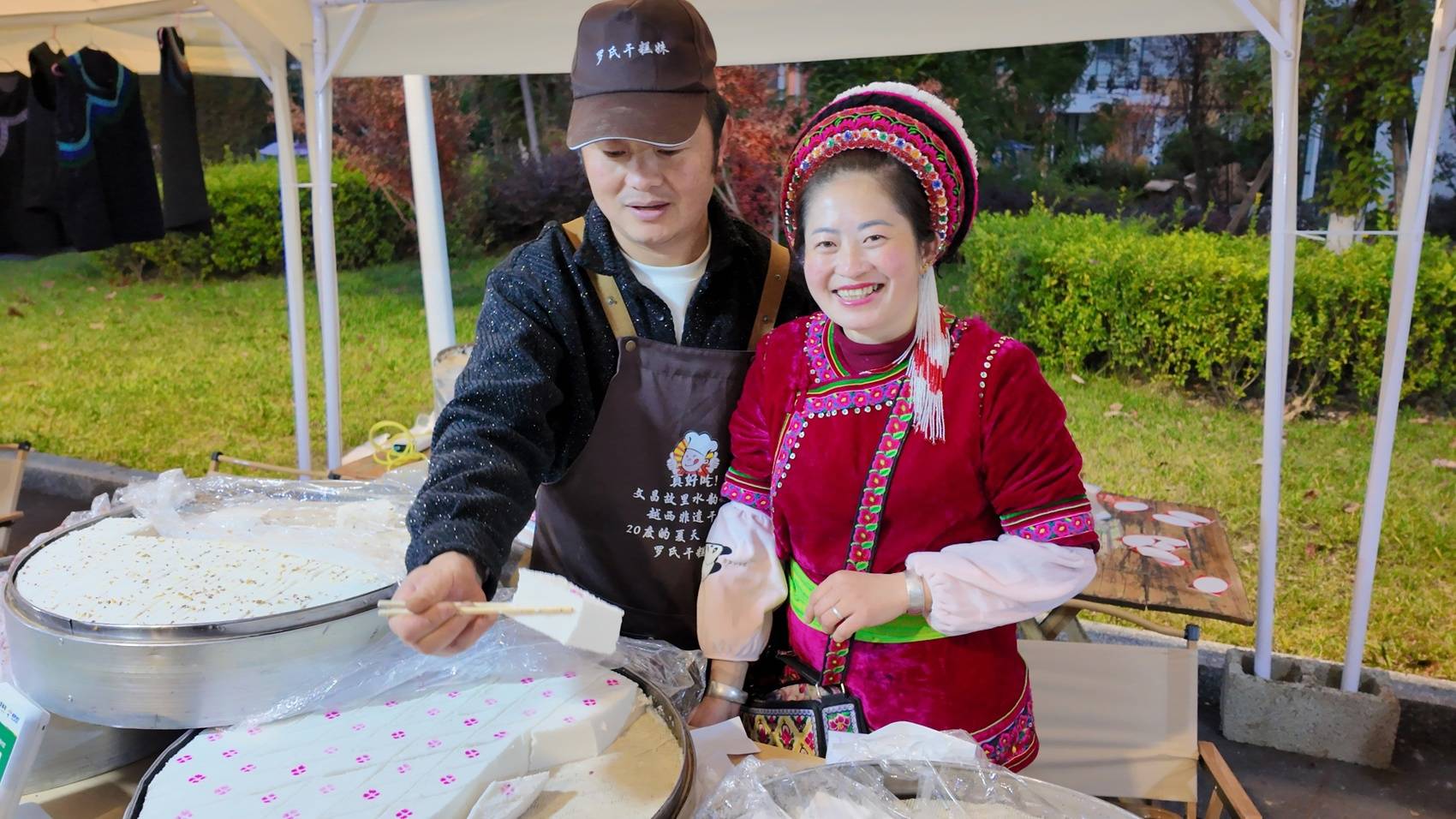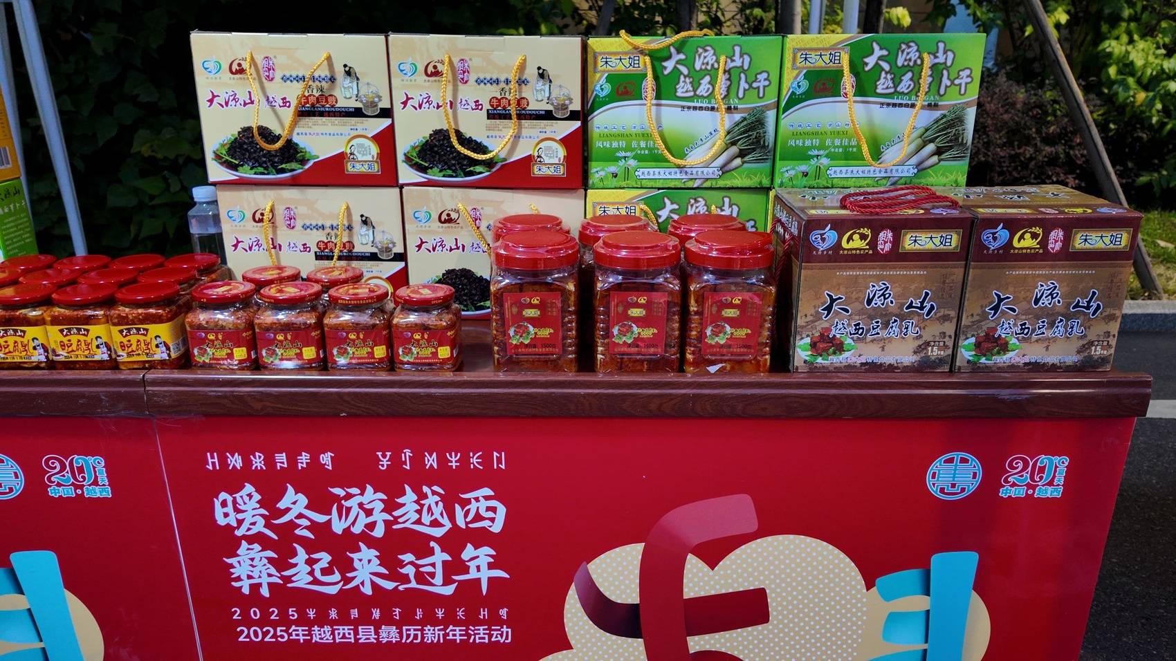 除了精彩节目,越西的文创美食同样吸睛。文创市集上,色彩斑斓的彝族漆器、手工刺绣等文创产品,尽显非遗魅力;越西苹果、葛根茶等农特产品备受游客青睐;干糕、卷粉等特色小吃搅动游客味蕾。