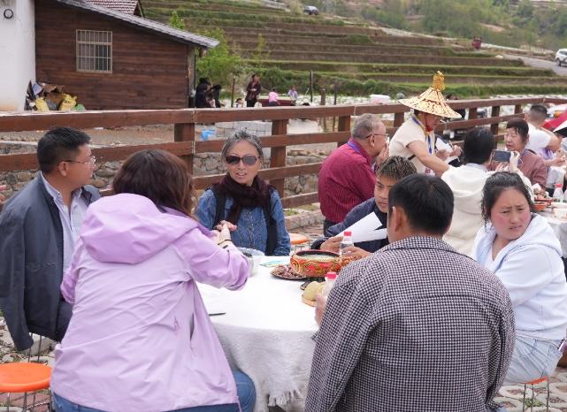 正午,梯田长街宴飘香,坨坨肉、苦荞粑等彝家美食沿长桌排开,游客与村民围坐共饮,品烟火乡情。午后,呷古彝寨非遗体验精彩纷呈:月琴声声、敬酒歌悠扬;彝绣研学基地内,游客可体验纺线、织布,选购彝绣产品;传统婚嫁展演、小吃市集同步开展。