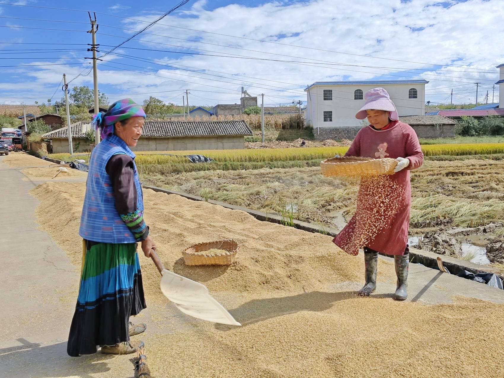 在稻田边,稻谷整齐地铺在过道边,村民们忙着筛稻壳、晾晒稻谷,采收完毕的水稻在装袋后进行运送售卖,将在不久后进入米市、端上餐桌。
