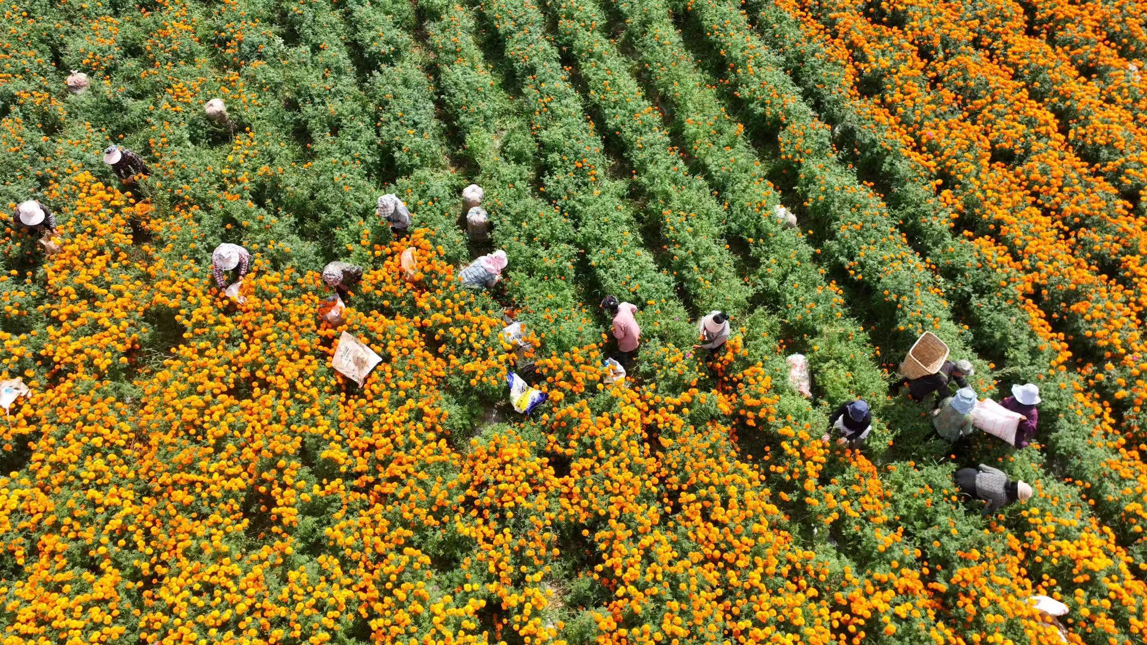 万寿菊种植简单管理方便,每个劳动力最多可管理10-15亩,收购公司通过"公司+基地+农户"的运作方式,让村民既可流转土地获得每亩500元租金,也可自种万寿菊由公司免费提供花苗和薄膜并保底收购。同时,公司优先聘用当地群众参与种植、采收等工作,务工人员日均收入可达160元以上。这种全产业链的就业带动模式,让群众在家门口就能获得稳定收益。