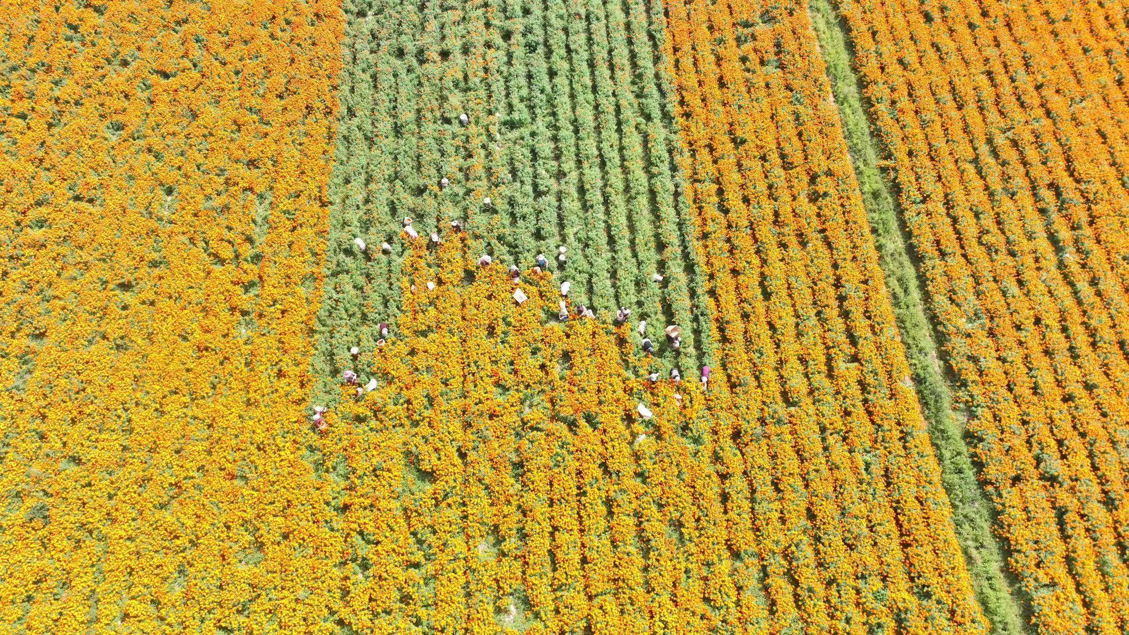 “我就住在这附近,原来在外面打工供两个娃儿读书,现在有老板包了这儿的土地,我就在这儿挣钱,一天能摘七八百斤,一天就有一百六七十元,我可以在家门口就挣钱供两个娃儿读书了。”万寿菊采摘工杨阿甲说。